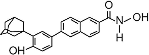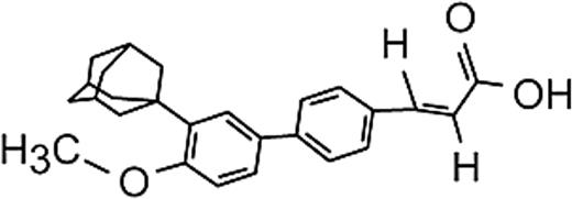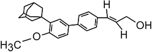 Novel compounds inducing apoptosis or programmed cell death (PCD) through mechanisms other than those activated by clinically used chemotherapeutic agents are needed. CD437 is the prototype of a promising class of cytotoxic compounds known as adamantyl-retinoids1-4 or retinoid-related molecules (RRMs).5,6 Throughout this article, RRMs will be used to indicate this class of compounds. CD437 is endowed with antitumor as well as antileukemic activity in various experimental models.7-13 The compound is characterized by a chemical structure similar to that of retinoic acid, and was originally developed as a selective agonist of retinoic acid receptor γ (RARγ).14-16 In cellular models of acute myelogenous leukemia (AML), CD437 induces rapid PCD.2,3,17 In AML and other cell types, the apoptotic process set in motion by CD437 does not require activation of RARγ or any other type of RAR and RXR nuclear retinoic acid receptors.2 Thus, the mechanism of action of the compound is different from that of all-trans-retinoic acid (ATRA) and other classic retinoids. Indeed, the RRM induces apoptosis in cells resistant to ATRA.18,19 In addition, a subline of the acute promyelocytic leukemia (APL)–derived NB4 blast made selectively resistant to CD437 (NB4.437r) maintains sensitivity to ATRA.3