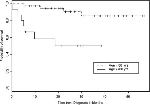 The trial showing that the addition of rituximab to the CHOP regimen increases complete response (CR) rate and overall survival (OS) in elderly patients (pts) with diffuse large B-cell lymphoma (DLBCL) did not include pts over the age of 80 (Coiffier, 2002, NEJM). There is very limited data on octogenarians with DLBCL. These pts are often treated with reduced-dose therapeutic regimens, which may lead to a poorer OS (Meyer, 1995, J Clin Oncol). We were interested in examining the proportion of pts with DLBCL aged 80 and over in our institution; to characterize the determinants of their OS; to assess how many received standard therapy; and, to define which characteristics lead physicians to withhold therapy. Patients and method: A retrospective chart analysis was conducted of clinical and pathological data on all new cases of DLBCL from 2004 to 2008. Clinical data collected included International Prognostic Index (IPI), LDH, therapy received, and survival. Pathologic data included presence or absence of bcl-6 and/or bcl-2 expression, and proliferative fraction as determined by the level of Ki-67. This study received IRB approval. A Kaplan-Meier survival analysis was performed, Fisher's exact test was used to estimate p value for proportions, and confidence intervals were estimated for means. Results: We identified 54 new cases of DLBCL with a median age of 69.5 years. Fifteen pts (27.8%) were age 80 or older. Male to female ratio was 1:1.5. The average IPI was greater in pts above 80 than in pts below 80 years of age, 3.0 [95% confidence interval (CI), 2.17-3.83] vs. 1.9 [95% CI, 1.51-2.29 ], respectively. The LDH was high in 57.9% (22/38) of pts in the younger group vs. 69.2% (9/13) of pts in the older group (p=0.52). The presence of bcl-6 in the younger group versus the older group was 88.6% (31/35) and 84.6% (11/13), respectively (p = 0.65). The expression of bcl-2 in the younger group versus the older group was 55.9% (19/34) and 66.7% (8/12), respectively (p=0.73). The proportion of younger pts vs. older pts with high Ki67 (>80%) was 45.7% vs. 53.8%, respectively (p= 0.75). Thirty six pts under age 80 received RCHOP compared to 7 pts 80 years and over (97.3% vs. 50%) (p=0.0006). There did not seem to be a correlation between IPI or co-morbidity and whether pts received treatment. However, therapy tended to be offered to outpatients but withheld from patients hospitalized at time of diagnosis. Chemotherapy had to be reduced or terminated due to poor tolerance in 1 patient in the younger cohort vs. 2 pts in the older cohort. Amongst the older group who did not receive RCHOP, 6 pts (85.7%) did not receive any chemotherapy, while 1 patient received 5 cycles of RCEPP. Kaplan Meier analysis for overall survival of pts under age 80 compared to over age 80 is shown below (HR = 7.0, 95% CI [2.0 – 24.2]), (p = 0.002). All pts above age 80 who did not receive any chemotherapy died vs. 25.0% (1/4) who received full dose RCHOP, vs. 66.7% (2/3) who received reduced RCHOP. The CR rate was 88.6% (31/35) for those aged under 80 vs. 75% (6/8) for those above age 80 (p=0.31), while the relapse rate was 11.4% (4/35) vs. 25% (2/8), respectively (p = 0.31). Conclusions: Though limited, these data reveal interesting findings about pts aged over 80 with DLBCL. With our aging population, more physicians will be faced with the question of how to treat the very elderly with this diagnosis. These pts had a poorer overall survival which, in large part, can be attributed to the fact that therapy was never administered. Age above 80 and hospitalization seemed to be the only clear reasons for withholding therapy. Elderly pts tended to have higher IPIs, but did not seem to have histologically more aggressive tumours. Interestingly, the pts over the age of 80 who died did tend to have more frequent expression of bcl-2. In contrast, all elderly pts who survived were bcl-6 positive. When standard therapy is given to pts over the age of 80, their response rates do not differ from those in younger pts. Further research into pts above 80 years of age with DLBCL is needed to confirm our findings. Nonetheless, our results raise questions about how we approach treatment of DLBCL in the very elderly and suggest that age alone should not prevent standard doses of therapy from being administered.
