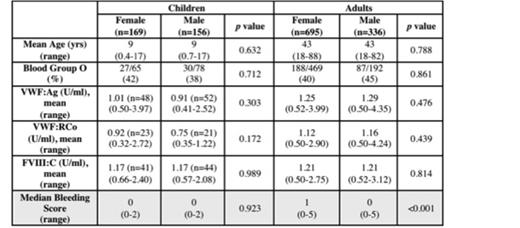 BS data from different studies, originally generated using 4 different Vicenza-based BATs, were compiled using a bioinformatics system created to facilitate the collation and analysis using different scoring systems. Demographic and BS data, along with blood group, VWF:Ag/VWF:RCo/FVIII:C (when available) were collected from all enrolled subjects. Data were derived from multiple studies; all defined normal subjects as those without a known problem with bleeding or bruising. All BATs were expert-administered. The normal range for both adults and pediatrics was determined by: 1) removing outliers > 3 SD away from the mean and then, 2) selecting the mid-95th %ile.