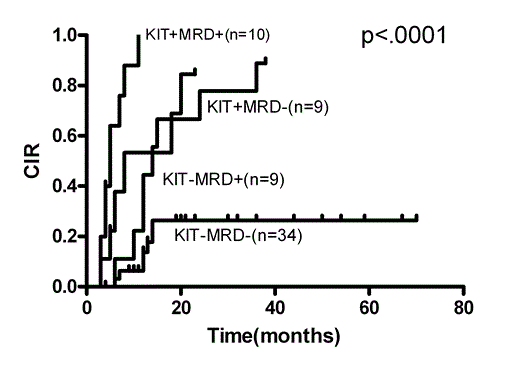 When receiving CT/auto-HSCT as postremission treatment, KIT+ patients (n=19) had a higher 3 year cumulative incidence of relapse (CIR) than KIT-patients (n=43) (94.4% vs. 38.2%, p<0.0001). Similar results also found in MRD+ (n=19) and MRD- (n=43) patients (CIR 92.9% vs. 46.6%, p<0.0001). Among KIT+ patients, a very high relapse rate was found in both MRD+ and MRD-patients (CIR, 100% vs.88.9%). However, among KIT-patients, MRD+ patients had a significant higher relapse rate than MRD-patients (CIR, 84.4% vs.26.3%, p=0.0006). When pooling KIT+ and or MRD+ into one group (KIT+/MRD+), this group had a significant higher relapse rate than KIT-MRD- group ( 94.4% vs. 26.3%, p<0.0001), However, the prognostic values of KIT and MRD was lost when patients received allo-HSCT (CIR of KIT+/MRD+ and KIT-MRD-, 23.8% vs. 15.6%, p=0.47). Similar results were also been found in disease-free survival (DFS) and overall-survival (OS). Multivariate analysis revealed that KIT+, MRD+, and treatment (allo-HSCT or CT/auto-HSCT) were three independent prognostic factors for relapse (all p<0.0001), DFS (all p<0.0001) and OS (p<0.0001, p<0.0001, p=0.007).
