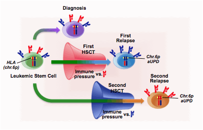 A 54 year old patient with high-risk refractory anemia with excess blasts (pancytopenia, blasts 19%, adverse cytogenetics) underwent unmanipulated T cell-repleted HLA-haploidentical HSCT in the presence of active disease. After one year of remission a first relapse occurred. HLA typing of the leukemic blasts harvested at relapse demonstrated the selective genomic loss of the mismatched HLA haplotype targeted by donor T cells, a frequent mechanism of leukemia immune evasion after haploidentical HSCT, first described by our group (Vago et al, N Engl J Med, 2009). The patient was re-transplanted from a different haploidentical donor mismatched for the HLA alleles retained by the mutated variants; accordingly, T cells from this donor were expectedly alloreactive against the relapsed leukemia. The patient re-obtained complete remission, which was maintained for five years, before the occurrence of a second relapse. Unexpectedly, at this relapse leukemic cells had lost the HLA molecules mismatched with the second donor, and expressed those that had gone amiss at first relapse. Since at both relapses HLA haplotype loss was due to a stable genomic alteration, chromosome 6p acquired uniparental disomy (aUPD), any linear relation between the first and second relapse could be ruled out (Figure 1). Leukemic samples at diagnosis, first relapse and second relapse were further characterized by high-depth exome sequencing, revealing that most of the mutations present in each of the three samples were not found in the other two: only a minute fraction of the mutations could be identified in all three disease presentations, possibly comprising the “driver mutations” harbored by the original leukemic stem cell clone. Amongst these shared mutations we are currently validating the functional and epidemiological relevance of missense alterations in the TP53 tumor suppressor gene, in the NHEJ1 gene (related to chromosomal instability), and in the BTNL8 gene, encoding the costimulatory receptor B7-H5, which may putatively play a role in leukemia recognition by T cells.