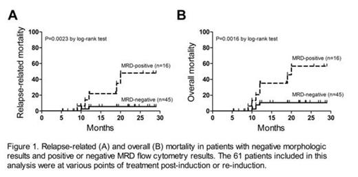 We evaluated outcomes in all patients with negative morphologic results and any positive MRD flow cytometry result(s). Of the 73 patients in this study, 61 had morphology-negative results that were either MRD-negative (n=45) or MRD-positive (n=16). Patients in this group were at various points of treatment post-induction or re-induction. Four out of 45 patients (9%) with MRD-negative results relapsed during a median follow-up period of 22 months, and 8 out of 16 patients (50%) with an MRD-positive result relapsed during a median follow-up period of 15 months (odds ratio for relapse 10.3, 95% confidence interval 2.5-42.4, P=0.001). In addition, relapse-related and overall mortality (Figure 1) were higher in patients with MRD-positive results (P=0.0023 and P=0.0016, respectively, by the log-rank test).
