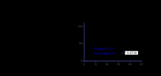 In pts with advanced stage disease (n=50), 27 (54%) pts achieved CR. Median OS duration was 13 months. 3-year OS rate was 25%, Among pts achieving CR after initial treatment (n=27), 9 underwent consolidative auto- (n=8) or allo- (n=1) SCT (median age 53, range 34-68) and 18 did not (median 61, range 18-84). Among pts undergoing frontline SCT, only 1 pt has experienced recurrence so far (4 months after auto-SCT) with a median follow up duration 17 months. However, 2 died without disease progression; one with treatment related lung toxicity (1 month post auto-SCT) and one with other comorbidities (14 months after auto-SCT). In pts achieving CR and undergoing frontline SCT, the 3-year OS rate was 66%. In pts achieving CR and not undergoing frontline SCT, the 3-year OS rate was 43%, but the difference was not statistically significant (Figure B. log-rank test 0.87, hazard ratio 0.82 for frontline SCT [95% CI 0.17-3.94, p=0.8)].