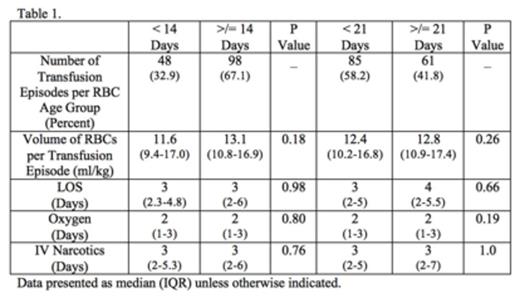 One hundred and forty-six episodes of ACS in 85 patients (46 male, 39 female, 77 HbSS, 1 HbSC, 4 Hb Sβ0, 1 Hb Sβ+, 2 HPFH) were included. Median (IQR) age of the patients was 8.9 (5.5-13.5) years. Median (IQR) storage age of the oldest unit of transfused RBCs was 18.5 (12.0-27.0) days. Median (IQR) volume transfused standardized by weight was 12.7 (10.6-16.9) mL/kg, with 29/146 (19.9%) receiving more than one RBC transfusion. In all 146 episodes of ACS, median (IQR) LOS after transfusion was 3.0 (2.0-5.0) days. Supplemental oxygen was required prior to transfusion in 109/146 (74.7%) of ACS episodes and for a median of 2.0 (1.0-3.0) days after transfusion. IV opioids were administered prior to transfusion in 93/146 (63.7%) of ACS episodes and for a median of 3.0 (2.0-6.0) days after transfusion. Table 1 describes outcomes compared with RBC age thresholds of 14 and 21 days.