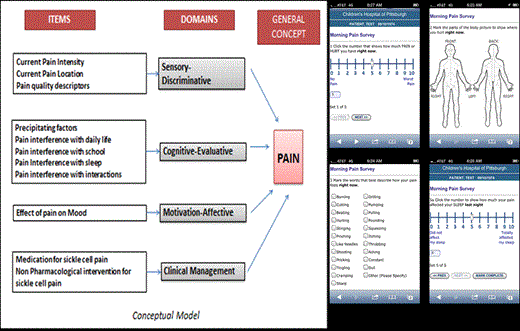 Content Validity: During the first iterative cycle, participants identified items that were difficult to understand, ambiguous or irrelevant. Number of items was reduced from 18 to 13. During the second iterative cycle, one repetitive item was removed and others minimally modified. To minimize user burden items were redistributed so pain intensity, location, quality and precipitating factors were asked twice daily; effect of pain on sleep was asked in the morning and pain interference with daily activities, mood, school and interactions and clinical management items were asked in the evening.