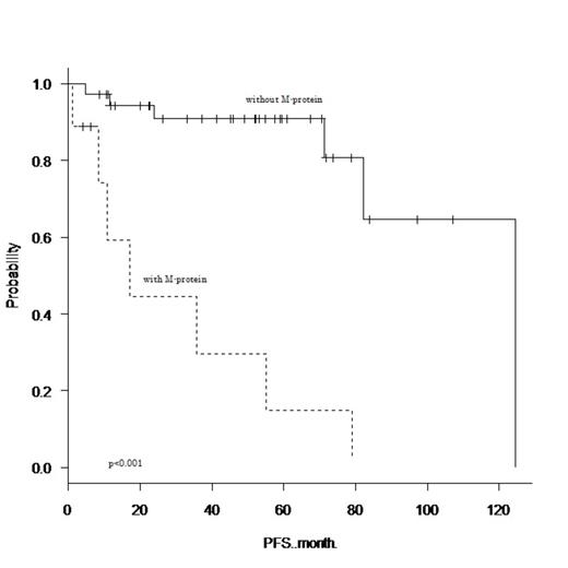 From January 2000 to June 2013, 52 extranodal MALT lymphoma patients (26 females and 26 males) were referred to our institution. The median age of the patients was 68 years (range, 43–89 years). Thirty-three (63%) patients had limited stage disease (stage I/II) and 48 (92%) patients had an ECOG performance status of less than 2. The cumulative numbers of patients who were diagnosed with orbit, thyroid, salivary gland, stomach, lung, and intestine disease were 7 (13%), 5 (10%), 9 (17%), 16 (31%), 16 (31%), and 4 (8%), respectively. Fifteen (29%) patients had a prior history of autoimmune disease, and a serum electrophoresis study detected M-protein in 9 (17%) patients (5 patients had IgG, 3 patients had IgM, and 1 patient had IgA). There was no significant correlation between the presence of M-protein and prior history of autoimmune disease (Fisher's exact test, p=0.46). Of the 32 patients who underwent cytogenetic studies, 9 (28%) had cytogenetic aberrations involving MALT1. Histological transformation to diffuse large B-cell lymphoma (DLBCL) was confirmed in 3 patients. After a median follow-up time of 53 months (range, 1–142 months), 16 patients had relapsed (MALT lymphoma relapse or transformation to DLBCL), and 1 patient had died due to lymphoma. The 4-year PFS and overall survival rate were 76.3% (95% confidence interval (CI), 60.0–86.7%) and 98.0% (95% CI, 86.6–99.7%), respectively. Among the clinical variables measured at diagnosis, univariate analysis found that advanced stage, three or more extranodal sites, serum soluble IL-2 receptor concentration higher than 700 IU/L, lymphocyte count higher than 1x10^9/l, hemoglobin concentration lower than 12.5 g/dl, and the presence of M-protein adversely affected PFS (p<0.05). In multivariate analysis including these six variables, only the presence of M-protein remained as a poor prognostic factor for PFS (hazard ratio (HR), 14.5; 95% CI, 1.47–142; p=0.021). The 4-year unadjusted PFS for patients with M-protein was 14.8% (95% CI, 7.36–47.6%), which was significantly poorer than that of patients without M-protein (90.9% [95% CI, 74.0–97.0%]; HR, 11.9; 95% CI, 3.46–41.1; log-rank, p<0.001). Seven of the 9 patients who had M-protein received rituximab-containing combination chemotherapy (R-CHOP 5 and R-CVP 2), and 5 patients relapsed in a relatively short time (median, 10 months; range, 2–54 months).