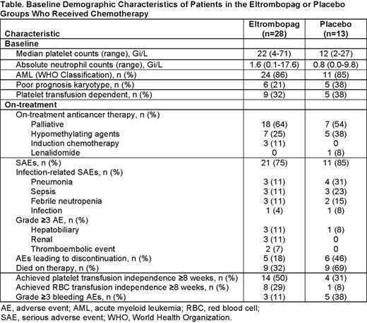 While on study treatment, a similar proportion of patients in both treatment arms of the trial received anticancer therapy (EPAG, n=28 [44%]; PBO, n=13 [38%]). The majority of patients receiving anticancer therapy in both the EPAG (64%) and PBO (54%) arms received palliative treatments (primarily hydroxyurea and low-dose cytarabine) followed by HMAs (Table). Induction chemotherapy was received by 11% of patients in the EPAG subgroup, compared with no patients in the PBO subgroup. For the subgroup of patients who received anticancer therapy, EPAG patients had higher baseline median platelet counts and absolute neutrophil counts, and a lower incidence of poor prognosis karyotype (Table). The percentage of patients with AML and those who were platelet transfusion dependent were similar between treatment arms at baseline (Table).