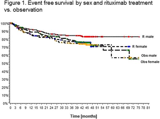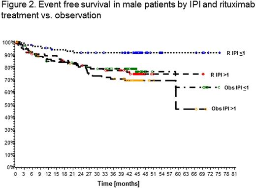 Results. Event free survival in male patients was superior in the rituximab maintenance treatment arm compared to observation (EFS at 3 years 84.1% vs. 74.4%; HR 0.58, 95% CI 0.36-0.94; p=0.0267) while no difference was observed in female patients (EFS at 3 years 76.8% vs. 78.7%; HR 1.5, 95% CI 0.67-1.66; p=0.8246) (Fig.1).The effect was particularly pronounced in male patients with low IPI (<1) (EFS at 3 years 91.2% vs. 78.2%), while this benefit was not as strong in male patients with IPI>1 (77.1% vs. 70.2%) or women with IPI<1 (79.5% vs. 82.5%) or >1 (74.7% vs. 75.7%) (Fig.2). In a multivariate analysis of factors associated with EFS in male patients R treatment together with age (<60 vs. >60 years), continent (Africa, America, Asia, Australia, Europe) and clinical stage (1/2 vs. 3/4) remained independent, while this was not observed in female patients. When IPI was included as a separate variable in the model, R treatment was the only independent factor in men. Similar analysis conducted for PFS showed a significant effect of R in men (PFS at 3 years 89.0% vs. 77.6% for observation; HR 0.45, 95% CI 0.25-0.79; p=0.0058) but not in women (83.7% vs. 80.5%; HR 0.79, 95% CI 0.47-1.33; p=0.3693). Again, R treatment and age were independent factors in multivariate analysis in men. PFS in patients with IPI<1 treated with R at 3 years was 96.1% in men vs. 89.2% in women. No significant differences in OS were observed at this time. Of note, more female patients receiving R maintenance had at least one adverse event CTC grade 3/4 (21.7% vs.12.3% in males, p=0.0297). Infections and infestations (all grades) occurred most frequently in female patients in the R arm (40.6% vs. 29.4% (male R) vs. 33.7% (male obs.) vs. 26.4% (female obs.); p=0.0341).