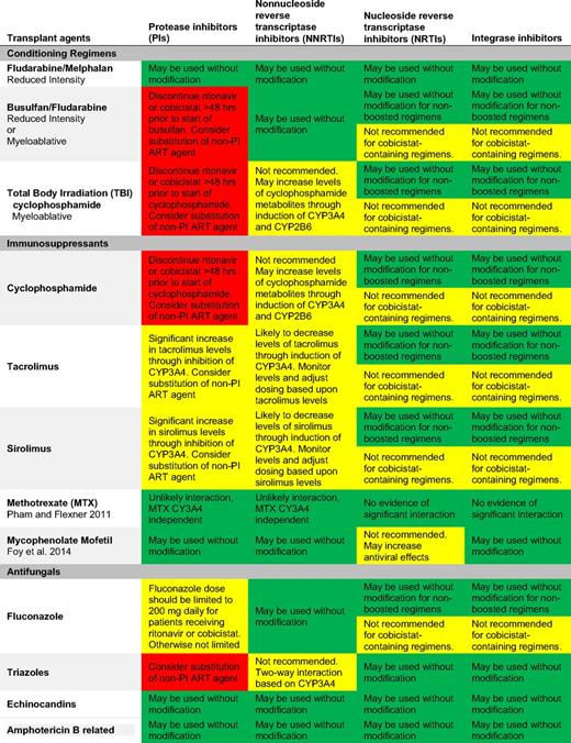 Peritransplant management of cART is more complex for alloHCT than for AHCT because of the number of potentially relevant drug-drug interactions between cART and the conditioning chemotherapeutic agents, immunosuppressive drugs, antimicrobials, and supportive care agents commonly used. We have summarized potential drug interactions between transplant agents and cART drugs and made recommendations in Table 1. Myelotoxic agents such as zidovudine should not be included in the cART regimen owing to the risk of delayed engraftment. Ritonavir-boosted protease inhibitors should be avoided. Integrase inhibitors have a drug interaction and toxicity profile that makes them a useful alternative unless formulated with cobicistat.69