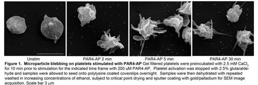 Microparticles are submicron lipid vesicles packed with protein and nucleic acid. They are found in abundance circulating in the vasculature and can be generated from a number of cell types including endothelial cells, leukocytes, and platelets. The microparticles generated from platelets far out number those generated from other cell types and their incidence is correlated with a myriad of cardiovascular diseases. We recently demonstrated that stimulation of gel filtered human platelets through Protease activated receptor (PAR) 4 leads to the generation of 4-5 times more platelet microparticles (PMP) than PAR1 stimulation. Platelet microparticle (PMP) production was demonstrated to be downstream of a Rho kinase-dependent signaling pathway. Consistently, more myosinIIa phosphorylation was observed downstream of PAR4 stimulation. PMP generation was quantified by flow cytometry using polystyrene microbeads of standardized size for appropriate size gating, and CD41a (aIIb) and CD62p (P-selectin) staining for positive identification of platelet derived membranes. Submicron particles positive for both CD41a and CD62p were classified as true PMP. Recently, we have expanded these observations to platelet stimulation with thrombin, convulxin (a GPVI collagen receptor agonist), and dual PAR/collagen receptor stimulation. Thrombin and PAR4-activating peptide (AP) stimulation leads to equivalent levels of PMP production, confirming that PAR4 is the major thrombin receptor responsible for PMP generation, with PAR1 playing only a minor role. Collagen receptor stimulation with convulxin lead to a comparable level of PMP generation as thrombin stimulation. However, co-stimulation with convulxin and thrombin or convulxin and PAR1-AP or PAR4-AP lead to PMP production exceeding the sum of PMP by convulxin and PAR agonist alone by as much as 350%, suggesting a synergistic response. It is well documented that PMP generation does not occur in the absence of extracellular Ca2+. Recently published data collected with Orai1 knockout mice indicate that the majority of extracellular Ca2+ entry into the platelet is mediated by the plasma membrane Ca2+ channel Orai1. STIM1 is an ER calcium sensor that migrates near the cell surface upon depletion of intracellular Ca2+ stores to oligomerize and activate Orai1. In an attempt to further elucidate the signaling pathways responsible for PMP generation we treated platelets with the STIM1 inhibitor SKF 96365. Preincubation with SKF 96365 nearly abolished PMP production induced by PAR4-AP, thrombin, convulxin, or the combination of PAR and collagen receptor agonist. Scanning Electron Microscopy of PAR4-AP stimulated platelets in suspension revealed extended filipodia and bag-like structures protruding from the platelet core which correlated with the size of PMPs as analyzed by flow cytometry. Pretreatment with the SKF 96365 or exclusion of extracellular Ca2+ prevented the formation of the microparticle-like extensions and blunted filipodia extension. Finally, confocal analysis of Orai1 staining on platelets spread on a collagen matrix and co-stimulated with PAR4-AP revealed Orai1 throughout the plasma membrane with intense staining of the microparticle-like structures. These data suggest that PMP generation is nucleated by STIM1 dependent Orai1 Ca2+ entry. Current efforts are focused on elucidating the mechanism by which PAR and collagen receptor agonists differentially regulate STIM1 or Orai1 activity to mediate PMP generation.