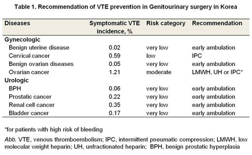 Even when considering relatively lower incidence of VTE in Asian people than that in Western, Korean genitourinary surgery patients revealed very low incidence of VTE. As stated above, abdomino-pelvic surgery is a procedure for high risk of bleeding complications. Therefore, it is reasonable to assume that the recommendation of pharmacologic thromboprophylaxis for other gynecologic surgeries except ovarian cancer surgery should be deferred until they reveal hard evidence of higher incidence of VTE in Korea.