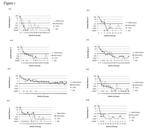 Thirty-six of 135 samples were also analyzed cytogenetically until the achievement of CCyR. As expected, Ph+cells were detected only in 25% (9/36) and 22,2% (8/36) of samples by CBA and I-FISH, respectively, whereas BCR-ABL1 mRNA was detected by qRT-PCR in 83.3% (30/36) of samples and Ph+ cells were detected by genomic Q-PCR in 91.7% (33/36) of samples (Figure 1).