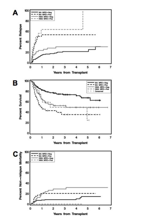 The negative impact of MRD on post-transplant relapse risk among AML patients in CR1 undergoing NMA HCT is similar to the negative impact seen in patients undergoing MA HCT. Because of the high rate of NRM among MRDneg NMA patients the survival difference between MRDneg and MRDpos patients was much larger in MA than NMA patients in this analysis.