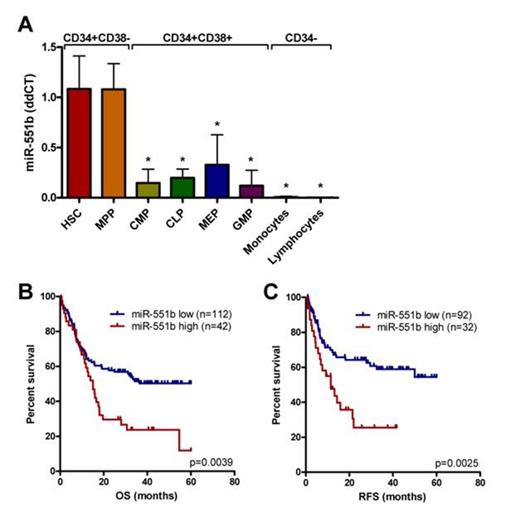 Our results show that miR-551b is a HSC specific miRNA and that high expression in AML is associated with a poor prognosis possibly because it reflects a stem cell-like state. Currently our research focuses on the functional role of miR-551b in normal and malignant hematopoiesis.