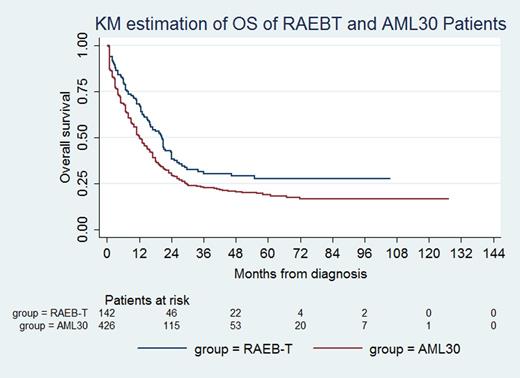 RAEBT is more similar to RAEB2 than to AML30 in terms of its clinicopathologic and cytogenetic features. In spite of less frequent treatment with intensive chemotherapy and higher karyotype risk, RAEBT patients had superior OS compared with AML30 patients. In a prior study (Estey E et al. Blood 1997;90:2969), RAEBT and AML30 patients treated with intensive therapy had similar outcomes; the advent of hypomethylating agent therapy may in part account for the differences found in our study. Our findings favor considering RAEBT in a disease category separate from AML with higher blast counts.