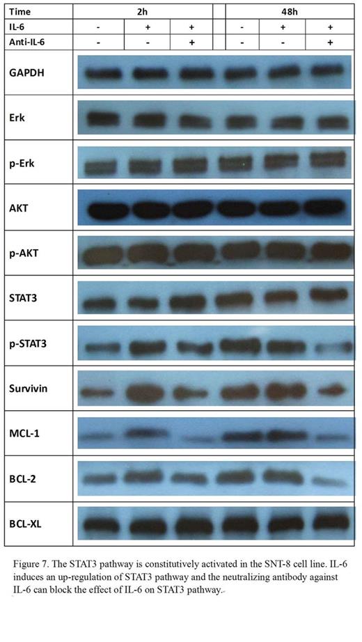 From January 2005 to December 2012, the paraffin sections of 91 patients with NK/TCL in Sun Yat-sen University Cancer Center were collected. The activation/expression of NF-ΚB(P50, P52, P65), IL-6,P-STAT3(Tyr705),BCL-2 in tumor microenviroment were investigated by immunohistochemistry. The NK/TCL cell lines were treated by IL-6(80ng/ml) and neutralizing IL-6 antibody, then the viability and apoptosis of lymphoma cell lines (NK-YS, SNK-6 and SNT-8) were assessed by CCK-8 and flow cytometry; and the expression of p-STAT3, BCL-2, BCL-XL, MCL-1, Survivin、p-ERK and p-AKT were examined by Western blot .