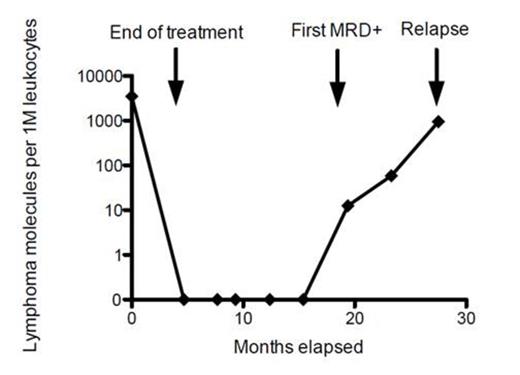 Twenty-seven pts, treated between July 1996 and July 2005, had adequate DNA from pre-treatment FFPE lymph node biopsies, and 25 (92.6%) had a high-frequency clonal rearrangement (MRD) detected. The median pt age was 49 years (20-75) and an IPI risk groups included 8 low, 3 low-intermediate, 11 high-intermediate and 3 high. The pts had a median of 12 surveillance CT scans (range 1-13) and 221 serum samples analyzed for MRD. Two pts progressed early after cycles 1 and 6. The first pt had progressive disease by CT scan after cycle 1 and remained MRD positive. The second pt remained MRD positive at the end of cycle 6, at which time a CT showed CR-unconfirmed, and progressed one month later. In the remaining 23 pts who achieved CR, seven relapsed at a median of 20.3 (range 5.6-151.6) months. The 16 pts in sustained CR had a median follow-up of 99.7 months (range 3.0-136.3) and none were MRD positive post-treatment (specificity 100%; 88.9-100%). There were 0 false positives in 200 post-treatment samples tested (specificity 100%, 99-100%). Of 7 relapsing pts, 6 had serum samples within 1 year of recurrence. Of these, 5 pts had a positive MRD (range 3.2 to 11.2 months) (sensitivity 83%; 44-98%) at a median of 9.2 months (range 3.2 to 11.2 months) prior to a positive CT scan (Figure). One relapsing pt only had a serum sample obtained 18 mos before CT recurrence and it was MRD negative.