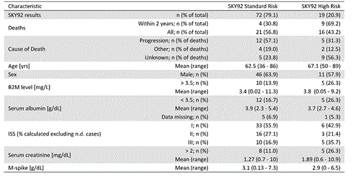 The SKY92 classifier identified 19 of 91 cases (21%) as high risk, recapitulating the percentage of high risk in previously studied cohorts (Kuiper et al. 2012). Moreover the hazard ratio of 11 when events up to 24 months or 8.18 when all events are considered, emphasizes the unmet medical need of high risk cases identified with SKY92 as 69% of all deaths within 2 years (9/13 death events) were in this category.