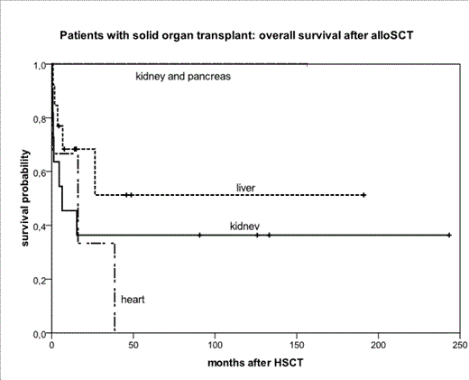 In summary, a significant proportion of patients enjoy long term survival without graft loss, especially after liver transplantation. Therefore our results suggest that alloHSCT is a feasible treatment option for patients after SOT. However, the risk of transplanted solid organ failure is high, including the possibility of solid organ rejection.