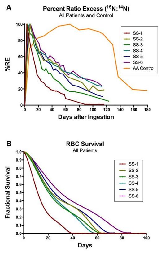 We enrolled individuals with HbSS in steady-state without hepatobiliary disease who had not been transfused in the preceding 3 months. After obtaining informed consent and duplicate baseline blood samples, participants ingested 15N-glycine and had serial phlebotomies over 16 weeks for blood counts, clinical chemistries, and storage of aliquots of frozen whole blood. Heme was extracted from frozen whole blood and analyzed using combustion isotope ratio mass spectroscopy at a commercial laboratory to give a precise ratio of 15N/14N, which is directly related to the number of cells remaining from the age cohort of RBCs that were produced in the presence of 15N-glycine. We defined the starting point for all RBC survival calculations as the time at which the percent ratio excess of 15N to 14N (%RE) reached 50% of the maximum value, and we defined the endpoint as the time at which the rate of change of %RE had decreased to 0.5% per day. To produce normalized RBC survival curves, the absolute %RE was corrected for any residual component evident at the endpoint by assuming a linear increase in the residual from the starting point to the endpoint. The normalized RBC survival curve was fit using a 5-order polynomial expression. Median survival, mean survival and mean RBC age were computed (Lindsell 2008).