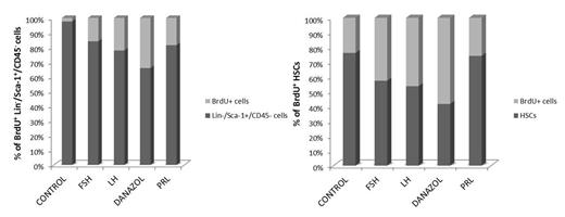 Our data indicate for the first time that not only danazol but also several pituitary-secreted sex hormones directly stimulate the expansion of stem cells in BM. This effect seems to be direct, as precursors of LT-HSCs and HSPCs express all the receptors for these hormones and respond to stimulation by phosphorylation of intracellular pathways involved in cell proliferation. These hormones also directly stimulated in vitro proliferation of purified HSPCs. In conclusion, our studies support the possibility that not only danazol but also several other upstream pituitary sex hormones could be employed to treat aplastic disorders and irradiation syndromes. Further dose- and time-optimizing mouse studies and studies with human cells are in progress in our laboratories.