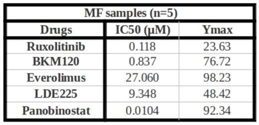 Briefly, mononuclear cells from peripheral blood, isolated, was cultured in Methocult TM GF_H4535 supplemented with 20 ng/ml interleukin (IL)-3, and 50 ng/ml stem-cell factor (SCF). After 2 weeks incubation, viable cells were plated at 15.000 per well in 96-well plates in increasing concentrations of each drug, alone or in combination with Ruxolitinib, in 8 or 5 point dose response curve. After 72 hr incubation, we performed a multiparametric flow cytometry, using Annexin V-fluorescein isothiocyanate (FITC) and CD13 to monitoring drug sensibility of myeloid lineage, in the ExviTech platform for screening by flow cytometry. Synergism will be evaluated by the Median Effect methods described by T-C Chou and P. Talalay.