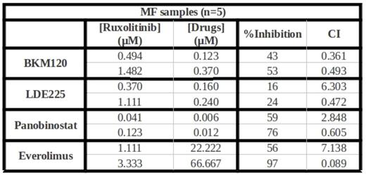Regarding the cell line model, it confirms the results obtained in patients samples: Panobinostat was the most potent drugs tested in the assay with an IC50 of 86 nM and the most synergistic drugs with Ruxolitinib was Everolimus (CI = 0.613 when Ruxolitinib and Everolimus were 370 nM and 7.41 μM respectively).