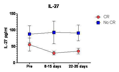 Between presentation and remission of AML, loss of leukemia burden and the recovery of normal hematopoiesis are likely to be associated with major changes in cytokine profiles which could inform pathophysiology of hematopoiesis and immune recovery and may be predictive for outcome. However cytokine fluctuations in AML before and after induction chemotherapy are not well characterized. To profile the cytokine signatures of patients with AML, we analyzed 57 cytokines, chemokines, and growth factors in blood of 11 patients with AML (mean age 58 years; 31-69) undergoing conventional remission induction chemotherapy enrolled into an investigational study (VICCHEM 1073). Plasma was obtained from heparinized peripheral blood collected at onset of leukemia, 8-14 days, and 22-35 days after the initiation of induction chemotherapy and also from 12 healthy donors. Cytokine levels were measured in duplicate using magnetic beads based Luminex assay (Affymetrix, CA, USA). Compared with normal controls, 5 cytokine patterns were observed. i) levels significantly lower at onset of leukemia, and lowest 8-14 days after induction correlating with lymphocyte count: GM-CSF, M-CSF, PDGF-AA, EGF, FGF basic, IL1b, IL-2,IL4, IL10, IL12p40, IL12p70, IL13, IL15, IL17a, IL22, IL23p19, TNF beta, TNF alpha, IFN alpha, IFN gamma, TGF alpha, MCP3, LIF, Granzyme B, sFAS ligand, TRAIL, (p<0.05). Most of these cytokines are predominantly produced by T cells or other immune cells. ii) levels significantly higher in AML through chemotherapy induction and recovery: IL-27 (p=0.002), MPO, IL2Ra, IL-21, , IP-10, MIG, MIP1 alpha, SDF-1, MCP1(p<0.05), HGF (p=0.05), VEGF (p=0.07), IL1Ra (p=0.058). These cytokines are predominantly produced by stromal cells. iii) levels significantly higher at the onset of leukemia and correlating with lymphocyte count: CD40 ligand (p<0.05). iv) levels significantly lower at onset of leukemia but inversely correlated with lymphocyte count; Flt3-ligand, sFAS (p<0.05). v) No significant differences and fluctuation: NGF, GRO alpha, IL1a, IL3, IL5, IL6, IL7, IL8, IL9, MIP1b, SCF. Among the cytokines persistently elevated in AML, IL-27 was significantly higher in patients who did not achieve complete remission after induction chemotherapy (p=0.03). To investigate the biological consequences of elevated IL-27 in the AML microenvironment, we examined the effect of IL-27 on T-cell function. Previous studies in mice show that IL-27 rapidly induces PD-L1 expression on naïve CD4+ T-cells. Human CD4+ naïve and CD4+ cells were isolated from healthy volunteers (n=4) according to RoboSep protocols (Stemcell Technologies, Vancouver, Canada), then incubated with IL-27 or IL-6 for up to 72 hours. IL-27 was found to induce PD-L1 expression in a time and dose-dependent manner especially in CD4+ naïve and central memory populations. These findings support other findings that AML suppresses protective antileukemic immune responses and cause T cell exhaustion. IL-27 production induced by AML cells may explain exhaustion of CD4+ T-cells through increased PD-L1 expression. Targeting IL-27 may improve immune function in AML and lead to better survival.