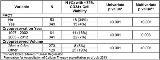 The cumulative incidence of neutrophil engraftment in the 128 myeloablative double-unit CBT recipients was 96% (95%CI: 93-100%). Reported Bank total nucleated cell (TNC) dose, Bank CD34+ cell dose, TC infused TNC dose, TC infused total CD34+ cell dose, TC infused viable CD34+ cell dose, and TC CFU dose were all significantly associated with neutrophil engraftment on univariate analysis. However, only the infused viable CD34+ cell dose was significant on multivariate analysis [HR=1.95 (1.33-2.86), p = 0.001, Figure]. Platelet engraftment was also strongly associated with infused viable CD34 cell dose (data not shown). To evaluate the reliability of CD34+ cell counts and determinants of viability, 402 units (302 domestic and 100 international) from 43 Banks thawed at our TC between 10/2005-5/2013 were then analyzed. For 7 selected Banks accounting for 135 (33%) units, there was strong correlation between Bank and TC CD34+ cell counts (r2 = 0.8, p < 0.001) with a median 92% CD34+ cell recovery at the TC (range 44-189%). However, for the remainder, there was greater variation in CD34+ cell recovery (range 12-1480%, median 107%) with a weaker (but still significant) correlation between CD34+ cell counts (r2 = 0.5, p < 0.001). In 40 (10%) units the recovery was less than 66%. Finally, while the median post-thaw CD34+ cell viability was 92%, it ranged 34-99%, and 33 units (8%) had <75% viable CD34+ cells. Unit characteristics significantly associated with CD34+ cell viability are shown in the Table. Bank location (domestic vs. international), shipping distance (New York vs. Australia), processing method (manual vs. automated or semi-automated) and unit hematocrit did not correlate with viability. In multivariate analysis, Bank FACT accreditation, year of cryopreservation, and cryovolume were associated with viability.