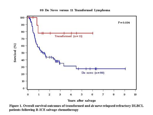 This retrospective review compared 100 consecutive DLBCL patients, 89 de novo and 11 transformed, at the Cleveland Clinic between 2000 and 2012. Inclusion criteria were: age ≥18 with relapsed/refractory DLBCL, prior treatment with R-CHOP and second-line R-ICE chemotherapy. Baseline characteristics were compared for categorical variables using the Chi-square test or Fisher's exact test; continuous and ordinal categorical variables were compared using the Wilcoxon rank sum test. Overall survival (OS) and progression-free survival (PFS) in transformed and de novorelapsed/refractory DLBCL patients were estimated using the Kaplan-Meier method and compared using the log-rank test. Stepwise multivariable analysis with a variable entry criterion of P<0.10 and a variable retention criterion of P<0.05 was used to identify multivariable prognostic factors.