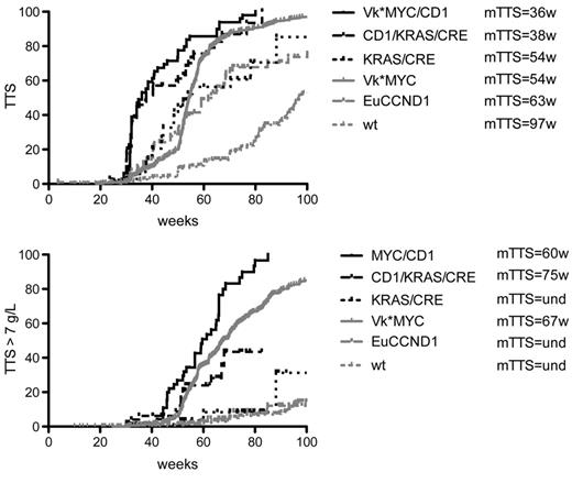 In conclusion, these data support our hypothesis that Cyclin Ds dysregulation in plasma cells is the initial transformation step leading to MGUS. Further oncogenic events, like activating mutations of KRAS are required to expand the monoclonal plasma cells. Among the oncogenes examined MYC provides the greatest acceleration of the MG in wildtype and EuCCND1 mice, and results in a disease with the malignant features of MM.