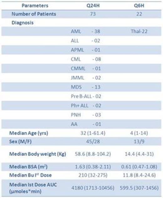 High-dose Busulfan (Bu) in combination with cyclophosphamide or fludarabine is widely used conditioning regimen prior to hematopoietic stem cell transplantation (HSCT) for various hematological malignant and non-malignant disorders. Intravenous (i.v) formulation of Bu, along with targeted dose adjustment has resulted in reliable systemic exposure (due to its predictable pharmacokinetics (PK)) while minimizing toxicity and treatment failure. We have previously demonstrated the population pharmacokinetics of oral Bu in thalassemia patients undergoing HSCT (Blood (ASH Annual Meeting Abstracts), Nov 2009; 114: 3349) and factors predicting or influencing the outcomes. Since 2010, a generic form of i.v Bu (BUCELON 60™, Celon Labs, India) with targeted dose adjustment has been used at our center, for HSCT with all Bu based conditioning regimen. There is no report on the PK of Bucelon in patients undergoing HSCT. The objectives of the present study were to evaluate the PK of Bucelon in patients undergoing HSCT, compare the systemic exposure to i.v Bucelon vs. previous reports in patients with various hematological diseases and report the toxicity and outcome after i.vBucelon in our patient cohort.