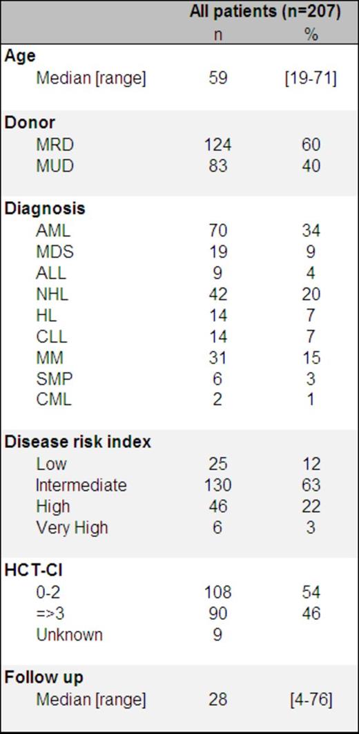 Patient characteristics are illustrated in the Table 1. Two hundred and seven patients with a median age of 59 years (range (19-71) were analyzed. Only 25 patients (12%) had low risk disease according to the disease risk index (DRI, Armand et al., Blood, 2012) and 90 patients (46%) had HCT-CI => 3. Grade II-IV and grade III-IV acute graft-versus-host disease (GVHD) at day 100 were 23% and 9% percent respectively. Overall cumulative incidences of total and extensive chronic GVHD were 37% and 22% respectively. Early NRM (day-100) and overall NRM (5-year) were 5% and 22% respectively. The 5-year cumulative incidence of relapse was 36%. Five-year progression-free survival (PFS) and overall survival (OS) were 41% and 52% respectively. At last follow up, 101 patients were disease free. Among them, 85 (84%) were free of GVHD treatment suggesting an unaltered quality of life for long term cured patients.