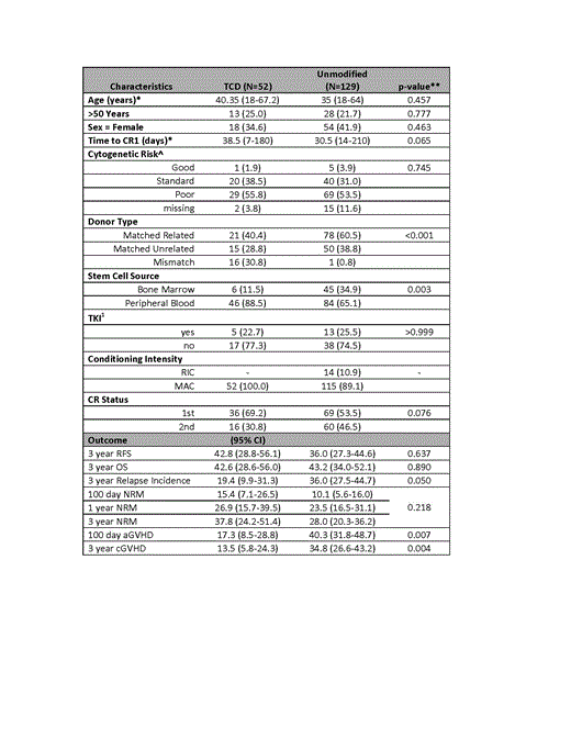 * *: P-values were estimated using a chi-square test or Fisher's exact test for categorical variables and a Wilcoxon rank-sum test for continuous variables. OS and RFS were compared using a logrank statistics, while NRM, aGVHD and cGHVD were compared using Gray's test.