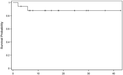 Seventeen MM patients with first VGPR or complete remission (CR) received allogeneic HCT between 01/2010 and 04/2013 at Moffitt Cancer Center (NCT 00948922). Eligible patients were age ≤ 60, achieving ≥ VGPR, and have suitable HLA-matched donors. Six patients received bortezomib plus lenalidomide induction, 7 received bortezomib-based, and 4 received lenalidomide-based induction. Three patients (18%) underwent autologous HCT with melphalan plus bortezomib conditioning (melphalan 100 mg/m2 for 2 days followed by bortezomib 1.3 mg/m2) following induction therapies in order to achieve further cytoreduction. Conditioning regimen before allogeneic HCT consisted of fludarabine 30 mg/m2 for 4 days and melphalan 70 mg/m2 for 2 days followed by a single dose of bortezomib 1.3 mg/m2 (Flu/Mel/Vel). GVHD prophylaxis was tacrolimus plus either methotrexate (n=9), or mycophenolate mofetil (n=4), or sirolimus (n=4). No maintenance therapy was prescribed after allogeneic HCT.