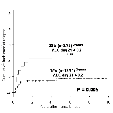 With a median follow-up of 60 months for survivors (range 2 to 116.5 months), 71 patients (75%) showed early recovery of ALC at day 21 (i.e. patients with ALC ≥ 0.2 x109/L at day 21), while 23 patients did not reach 0.2x109/L of ALC at day 21 (i.e. patients with ALC ≤ 0.2 x109/L at day 21). The overall survival (OS) and non-relapse mortality (NRM) were not significantly different between the groups: for 3 years OS rate, 47% in early ALC recovery group vs 35% in late ALC recovery group (p=0.35 ); for 3 year NRM rate, 38% in early ALC recovery group vs 26% in late ALC recovery group (p =0.33 ). However, a lower incidence of relapse was observed in early ALC recovery group (17%) compared to late ALC recovery group (39% at 3 years; p=0.005).