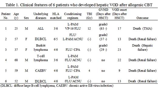 During 2011-2012, 45 patients were received allogenic HSCT in the second internal medicine department of our university hospital. None of these patients ,however, were received planned prophylactic FFP infusions, and as a result six patients undergoing allogenic cord blood transplantation (CBT) developed VOD. Clinical features of these 6 patients are shown in Table 1.