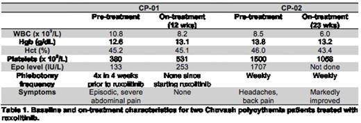 Recently, the VHL protein was shown to target phosphorylated JAK2 (pJAK2) for ubiquitin-mediated degradation. CP-associated VHL mutants were unable to degrade pJAK2, thereby leading to hyperactivation of downstream STAT signaling. In a CP mouse model, treatment with a JAK2 inhibitor led to normalization of hematocrit and reduction in splenomegaly. These findings provide a strong rationale for JAK2 inhibition as a therapeutic modality for CP. We now report preliminary data from two CP patients treated with the JAK inhibitor ruxolitinib.