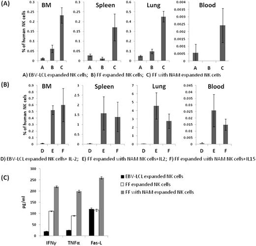 These data show human NK cells expanded ex vivo in NAM utilizing FF conditions substantially up-regulate CD62L, have enhanced inflammatory cytokine secretion against tumors, and have improved in vivo proliferation and homing to multiple organs including the bone marrow compared to EBV-LCL expanded NK cells. These differences suggest NAM expanded NK cells could have superior clinical efficacy compared to EBV-LCL expanded NK cells following adoptive transfer into patients with hematological malignancies and metastatic cancers.