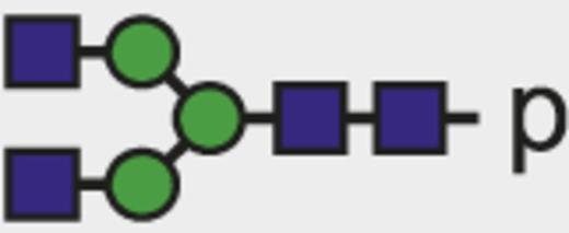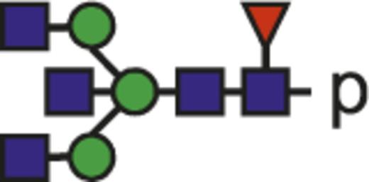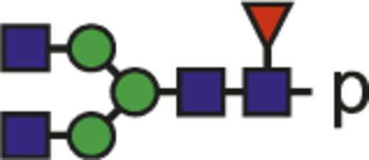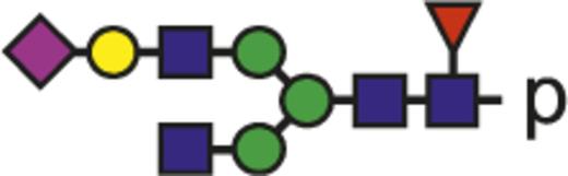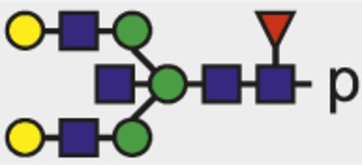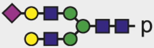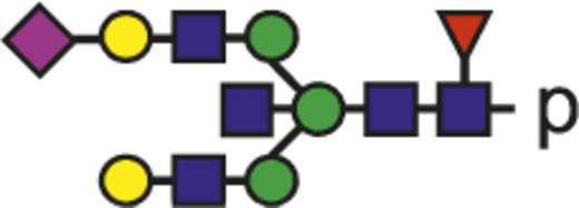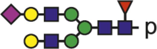 Blue square indicates N-acetylglucosamine; green circle, mannose; yellow circle, galactose; purple diamond, N-acetylneuraminic acid (sialic acid); and red triangle, fucose.