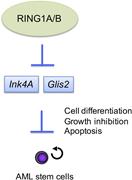 Acute myelogenous leukemia is organized as an aberrant developmental hierarchy maintained by leukemia stem cells. Ring1A and Ring1B repress expression of Gli-similar 2 (GLIS2) to maintain leukemia stem cells. The image shows leukemia cells stained with anti-GLIS2 (red) after deletion of Ring1A and Ring1B and cell nuclei stained with 4′,6-diamidino-2-phenylindole (blue). See the article by Shima et al on page 1833.