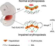 Immunofluorescence staining of Kit ligand (KitL; red) in E12.5 murine fetal liver hepatoblasts (green). Inactivation of Ezh2 in fetal liver endothelium leads to cell extrinsically mediated anemia caused by overexpression of Mmp9, which depletes the membrane-bound form of KitL. See the article by Neo et al on page 2223.