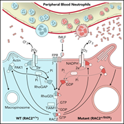 COS-7 cells transfected with wild-type RAC2 and green fluorescent protein expression vectors. Staining of RAC2 (red) and F-actin (orange) shows a nascent phagocytic cup with high levels of RAC2 protein (cell on right). Unlike mutant RAC2[E62K], overexpression of normal RAC2[wild-type] does not affect actin formation. See the article by Hsu et al on page 1977.