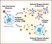 Induction of interferon-induced transmembrane protein 3 (IFITM3) in human megakaryocytes prevents dengue virus infection. Mature CD34+-derived megakaryocytes expressing IFITM3 (magenta) are protected against dengue virus infection (yellow). Nuclei were stained with TO-PRO-3 (blue). See the article by Campbell et al on page 2013.