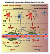 Dual cholinergic signals regulate daily migration of hematopoietic stem cells and leukocytes