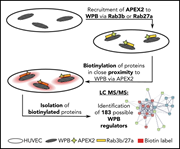 Confocal image of human umbilical vein endothelial cells expressing a Rab27a-APEX2 construct that localizes to Weibel-Palade bodies (WPBs). APEX2 activation leads to the biotinylation of proximal proteins that constitute the WPB-associated proteome. See the article by Holthenrich et al on page 979.