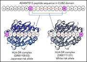 HLA loci predisposing to immune thrombotic thrombocytopenic purpura (TTP) in the white population have been described. In this study, analysis of the HLA haplotypes in 52 Japanese immune TTP patients identifies a different predisposing haplotype from that in whites. Interestingly, modeling different predisposing DRB1 alleles in the Japanese and white populations predicts binding to the same ADAMTS13 peptide.