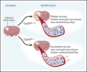 Ischemia-perfusion injury leads to extension of tissue loss following ischemic stroke. Denorme et al demonstrated in mouse knockout models that platelet cyclophilin D induces platelet necrosis, and necrotic platelet-neutrophil aggregates amplify ischemic injury. Targeting cyclophilin D limits ischemia-reperfusion injury without risking bleeding by inhibiting platelet function.