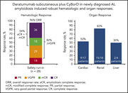 Palladini et al provide early results of a prospective trial of subcutaneous daratumumab in combination with cyclophosphamide, bortezomib, and dexamethasone as first-line therapy for AL amyloidosis. They report that the regimen has high complete hematological and organ response rates and that toxicity is as expected with these classes of drugs.