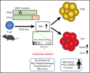 Activating mutations in VAV1 are seen in mature T-cell neoplasms (TCNs), and Fukumoto et al illuminate their oncogenic role in tumorigenesis in transgenic mice. Transgenic expression of mutant VAV1 on a p53-null background promotes accelerated death from TCNs associated with myc pathway activation.